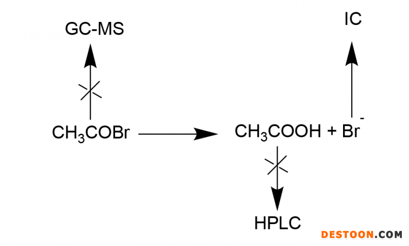 檢測(cè)物質(zhì):乙酰溴檢測(cè)難點(diǎn):起初使用氣質(zhì)法對(duì)殘留試劑乙酰溴直接進(jìn)行檢測(cè),但是靈敏度不達(dá)要求??紤]到乙酰溴極易水解,水解后可以檢測(cè)生成的乙酸,即可達(dá)到定量檢測(cè)乙酰溴的目的。但是,通過嘗試我們發(fā)現(xiàn),因乙酰溴為遺傳毒性雜質(zhì),其限度很低,即使使用高端儀器仍無法解決乙酸檢測(cè)靈敏度低的問題。