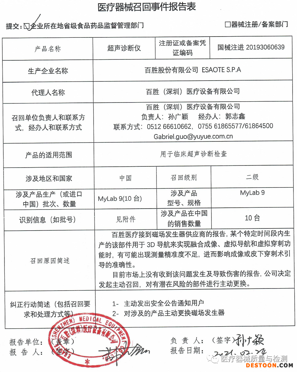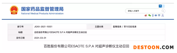 百勝股份有限公司ESAOTE S.P.A代理人百勝(深圳)醫(yī)療設(shè)備有限公司報告,因接到磁場發(fā)生器供應(yīng)商的報告稱,某個特定時間段內(nèi)生產(chǎn)的該部件用于3D導(dǎo)航來實(shí)現(xiàn)融合成像、虛擬導(dǎo)航和虛擬穿刺功能時,可能出現(xiàn)測量精準(zhǔn)度不足,進(jìn)而影響成像或皮下穿刺術(shù)引導(dǎo)的準(zhǔn)確性。百勝股份有限公司ESAOTE S.P.A對其生產(chǎn)的超聲診斷儀主動召回。