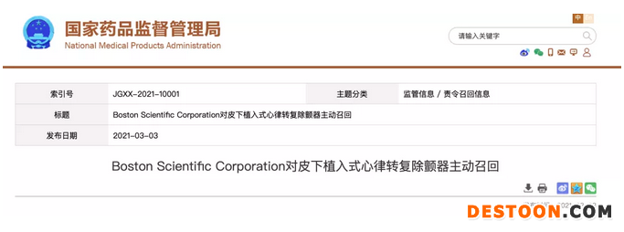 3月3日,國家藥監(jiān)局發(fā)布消息,波科國際醫(yī)療貿(mào)易(上海)有限公司報告,由于涉及特定型號、特定批次產(chǎn)品在放電治療過程中出現(xiàn)電壓過載的情況,可能會導(dǎo)致嚴(yán)重的不良事件。生產(chǎn)商Boston Scientific Corporation對皮下植入式心律轉(zhuǎn)復(fù)除顫器(注冊證號:國械注進(jìn)20153212410)主動召回。召回級別為一級。