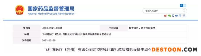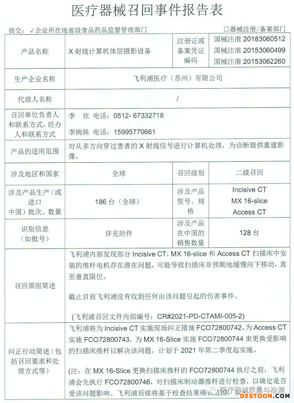 飛利浦醫(yī)療(蘇州)有限公司報告,該企業(yè)在內(nèi)部檢測發(fā)現(xiàn)部分incisive CT,MX16-slice和Access CT掃描床中安裝的推桿電機(jī)存在問題,可能導(dǎo)致掃描床非預(yù)期緩慢向下移動,現(xiàn)主動召回,召回級別為二級。