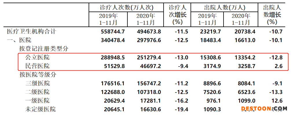 醫(yī)院29.8億人次,同比下降12.5%,其中:公立醫(yī)院25.1億人次,同比下降13.0%;民營醫(yī)院4.7億人次,同比下降9.4%,后者診療人次不足前者1/5。