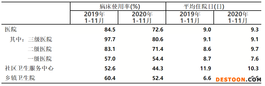在病床使用情況方面,2020年1-11月,醫(yī)院病床使用率為72.6%,同比下降11.9%;社區(qū)衛(wèi)生服務(wù)中心為44.3%,同比下降8.3%;鄉(xiāng)鎮(zhèn)衛(wèi)生院為52.4%,同比下降8.0%。三級醫(yī)院平均住院日為9.1日,與上年持平,二級醫(yī)院平均住院日為9.7日,比上年增加1.1日。