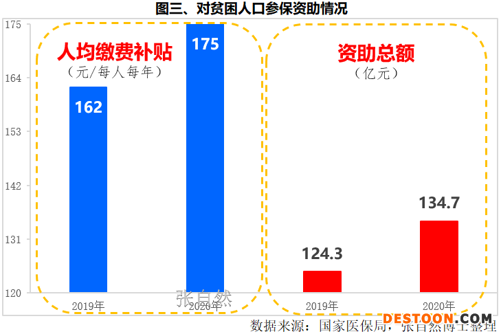 鼓勵(lì)貧困人口參加醫(yī)療保險(xiǎn),到2020年,貧困人口參保率提高到了99.9%以上。對(duì)特困人員參加城鄉(xiāng)居民醫(yī)保實(shí)施全額資助,對(duì)其他貧困人口實(shí)施定額資助,人均繳費(fèi)補(bǔ)貼由2019年的162元/每人每年提高到了2020年的175元/每人每年,資助總額由2019年的124.3億元提高到了2020年的134.7億元(圖三),醫(yī)保扶貧政策累計(jì)資助貧困人口參保2.3億人次,已累計(jì)資助參保支出369億元。