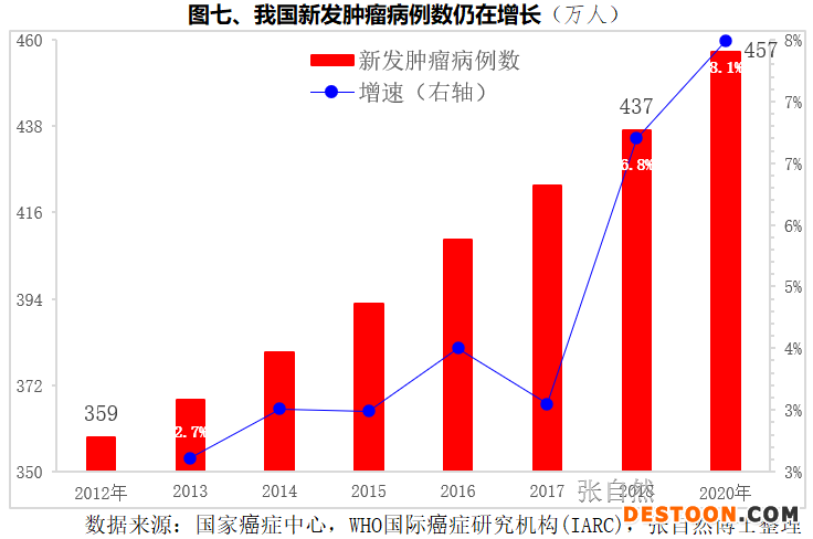 我國(guó)腫瘤發(fā)病人數(shù)還在繼續(xù)增長(zhǎng),已由2012年的359萬(wàn)人增長(zhǎng)到2020年的457萬(wàn)人(圖七)。