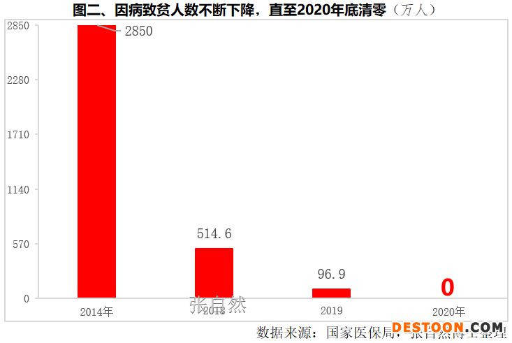 因病致貧人數(shù)由2014年的2850萬(wàn)人下降到了2019年的96.9萬(wàn)人,下降了96.6%,直至2020年底清零。(圖二)