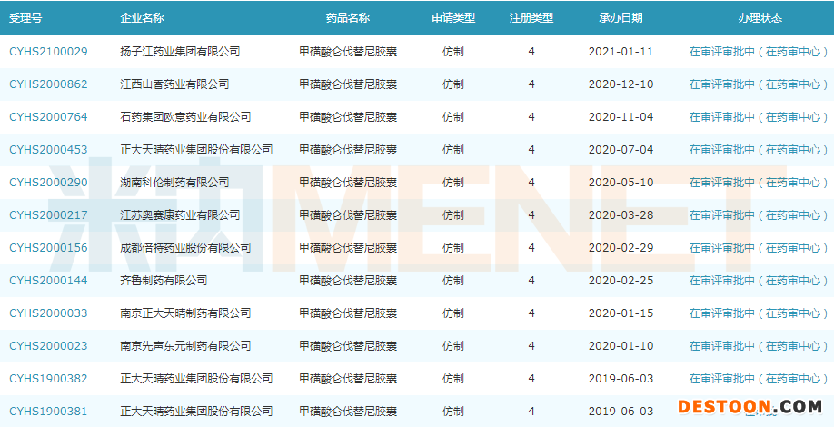 目前國內(nèi)市場共有10家企業(yè)提交甲磺酸侖伐替尼膠囊仿制4類上市申請,涉及正大天晴、先聲藥業(yè)、齊魯制藥、科倫藥業(yè)、石藥集團、揚子江藥業(yè)及奧賽康等。正大天晴藥業(yè)集團的甲磺酸侖伐替尼膠囊注冊辦理狀態(tài)已變更為“在審批”,有望奪下首仿。