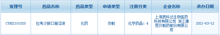 3月16日訊 3月12日,CDE官網(wǎng)數(shù)據(jù)顯示,上海奧科達(dá)生物醫(yī)藥科技|浙江康恩貝制藥申報的拉考沙胺口服溶液4類仿制上市申請獲得承辦。拉考沙胺是第三代新型抗癲癇藥物,目前市場上片劑和注射劑已有國內(nèi)首仿,糖漿劑僅有進(jìn)口批文,暫無口服溶液的國產(chǎn)批文。