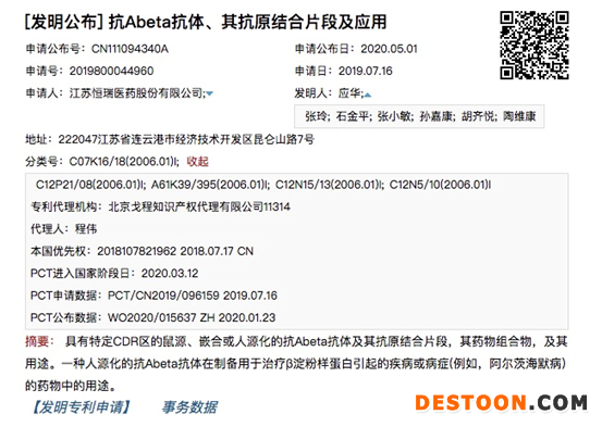 不過,Aducanumab還是沒能逃過前輩們的宿命。2019年3月,渤健宣布終止Aducanumab的III期臨床試驗。彼時恒瑞實驗室對于Aβ的研究已經(jīng)是如火如荼,接近提交成果的時刻,4個月后恒瑞在國家知識產(chǎn)權局提交的專利申請通過。