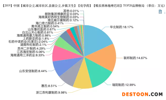 米內(nèi)網(wǎng)數(shù)據(jù)顯示,華北制藥將近占據(jù)該藥百分之二十的市場份額位列第一,此外,還有聯(lián)邦制藥、瑞陽制藥的市場份額超過百分之十,而原研惠氏的市場份額則被擠壓至8.51%。