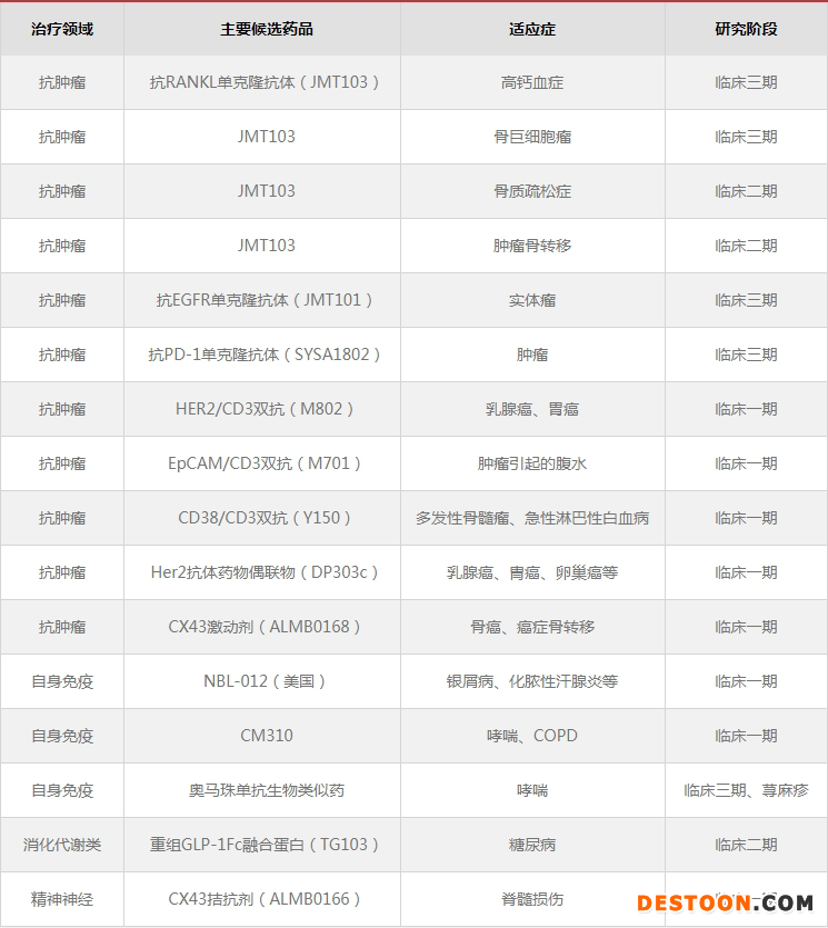 40余項在研大分子創(chuàng)新藥中,16項處于臨床研究階段,其中5項注冊臨床,20余項處于臨床前研究階段??筊ANKL單克隆抗體(JMT103)、抗EGFR單克隆抗體(JMT101)、抗PD-1單克隆抗體(SYSA1802)、奧馬珠單抗生物類似藥等均處于III期臨床研究階段,JMT103預(yù)計將于2022-2023年上市。