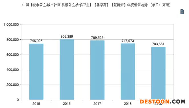 近年來(lái),氨溴索的銷售額有所下滑,不過(guò)降幅不大,相對(duì)穩(wěn)定,依舊保持在一個(gè)較高的水平。米內(nèi)網(wǎng)數(shù)據(jù)顯示,2019年中國(guó)公立醫(yī)療機(jī)構(gòu)終端氨溴索銷售額超過(guò)70億元。