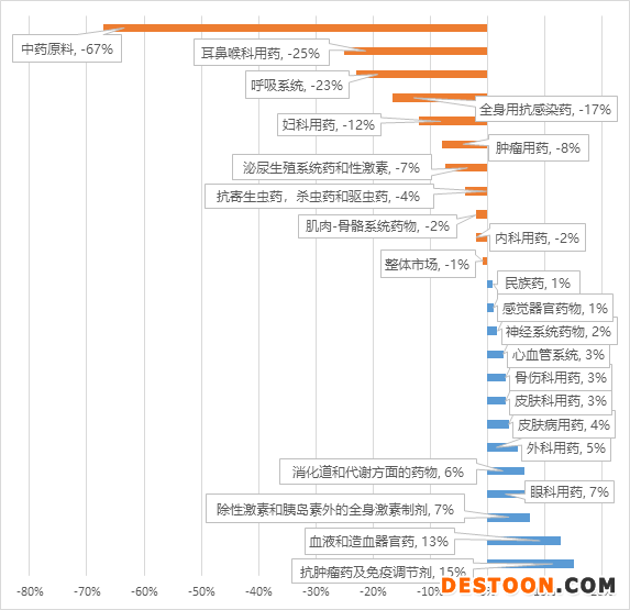 從治療領域來看,2020年在整體市場增速下降的背景下,半數(shù)治療領域的藥品市場規(guī)模均呈現(xiàn)負增長,其中抗感染和呼吸系統(tǒng)等市場份額占比較高的治療領域出現(xiàn)較大程度下滑。在創(chuàng)新藥上市且快速進入醫(yī)保的驅動下抗腫瘤藥及免疫調(diào)節(jié)劑是增速最快的治療領域,血液和造血器官藥增速緊隨其后。