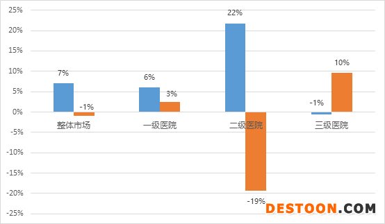 2020年,各級醫(yī)院市場規(guī)模增長情況大相徑庭,一級醫(yī)院增速為2.51%,略高于整體市場;而二級醫(yī)院增速為-19.3%,較2019年21.75%的增長,出現(xiàn)大幅下降,也是整體市場停止增長的主要原因;三級醫(yī)院增速為9.63%,較2019年,在市場規(guī)模占比和增速上都有明顯提升。