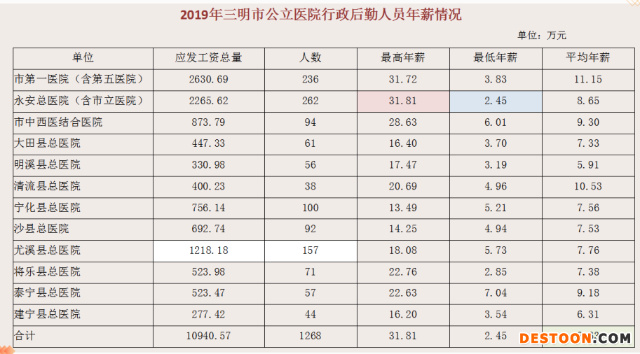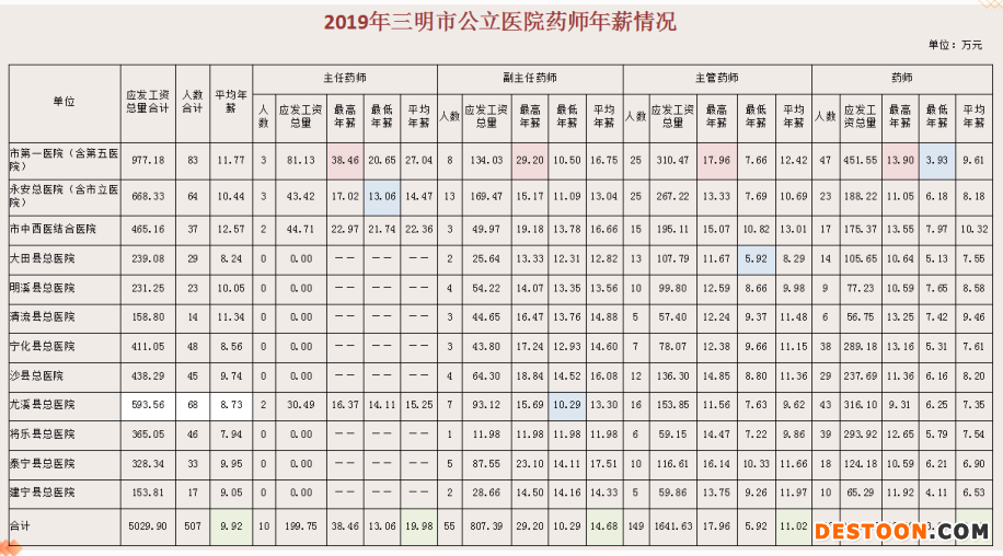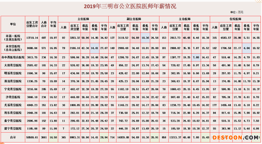 數(shù)據(jù)顯示,2019年三明市12家總醫(yī)院主任醫(yī)師年薪最高近60萬元,最低15萬元,平均30萬元;副主任醫(yī)師最高年薪55萬元,最低10萬元,平均年薪21萬;主治醫(yī)師最高41萬元,最低7.8萬元,平均15萬元;住院醫(yī)師最高29萬元,最低4萬元,平均約11萬元。