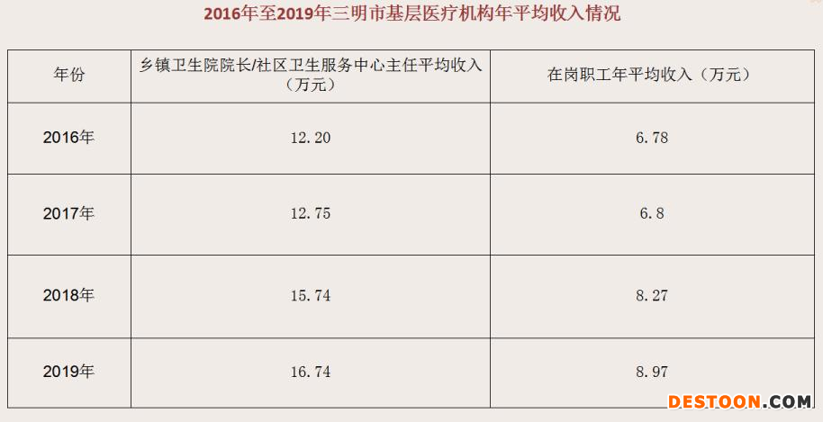 2019年三明市鄉(xiāng)鎮(zhèn)衛(wèi)生院院長(主任)年平均年薪達(dá)16.74萬元、在崗職工年平均年薪8.97萬元,全市村醫(yī)平均年薪達(dá)6.07萬。