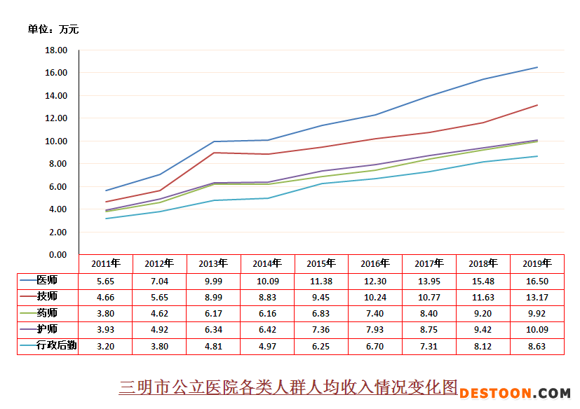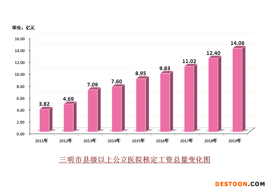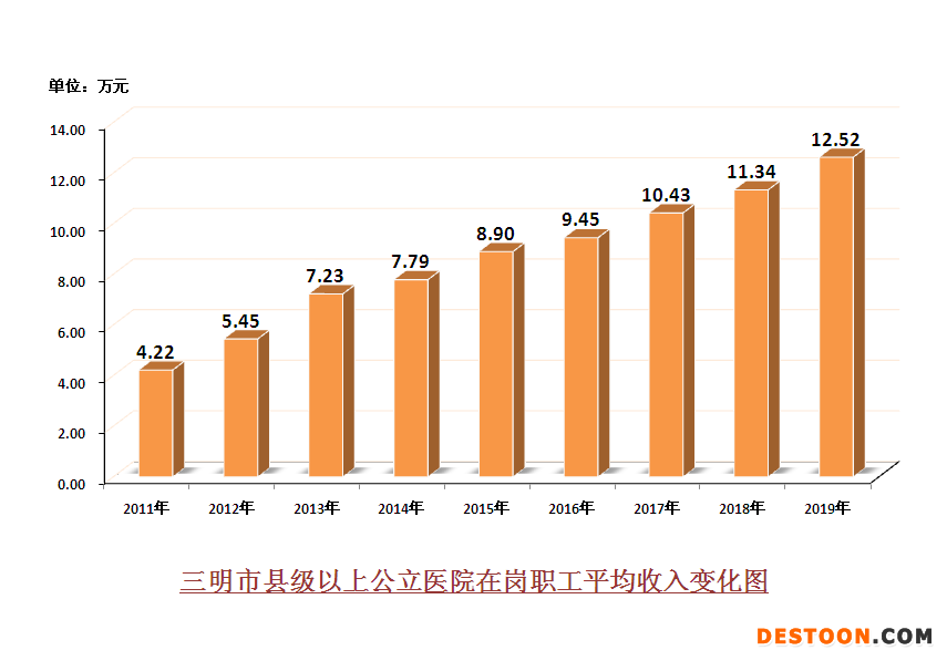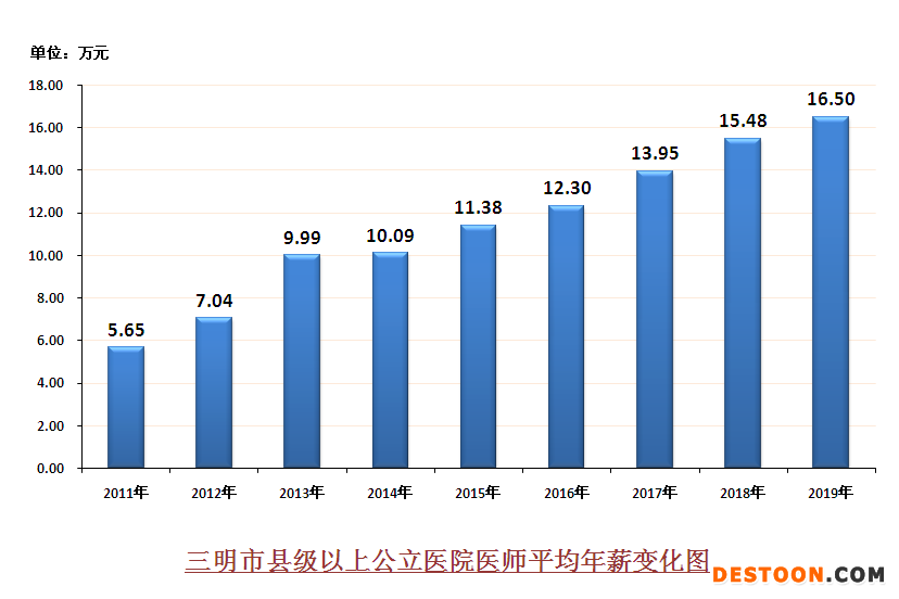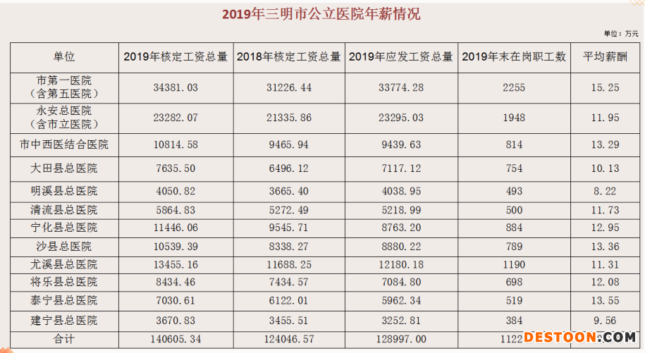 據(jù)了解,2019年,三明全市12家總醫(yī)院工資總額14.06億元,是改革前2011年的3.68倍。在崗職工平均年薪由改革前2011年的4.22萬元,增長到2019年的12.52萬元;院長平均年薪由9.84萬元增加到39.84萬元。