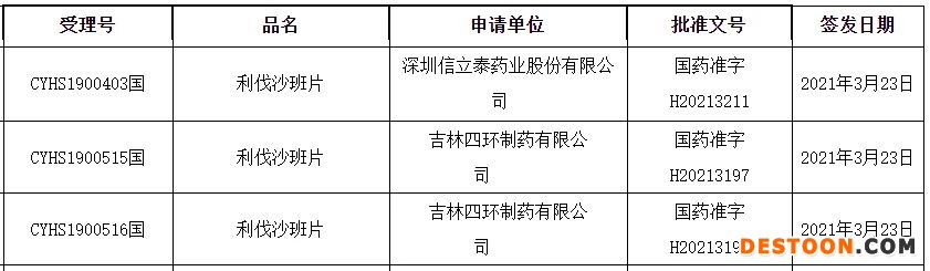 3月29日訊 3月25日,NMPA發(fā)布最新藥品批準(zhǔn)信息,再有兩家藥企獲得了利伐沙班片的生產(chǎn)批文,目前該品種過(guò)評(píng)企業(yè)已達(dá)12家。利伐沙班是全球最暢銷(xiāo)的抗血栓藥,2020年合計(jì)全球銷(xiāo)售額超過(guò)70億元,原研產(chǎn)品進(jìn)入中國(guó)市場(chǎng)后銷(xiāo)售額也一路飆漲,但隨著在中國(guó)的專(zhuān)利到期,國(guó)產(chǎn)仿制藥已蓄勢(shì)待發(fā),國(guó)采激戰(zhàn)勢(shì)不可擋。