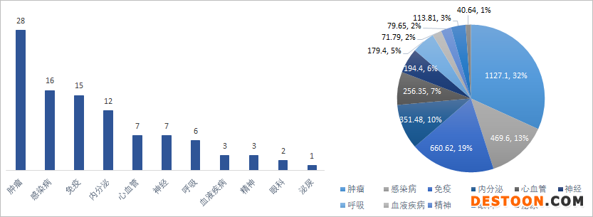 2020年TOP100藥品疾病領域分布(數(shù)量、銷售收入)