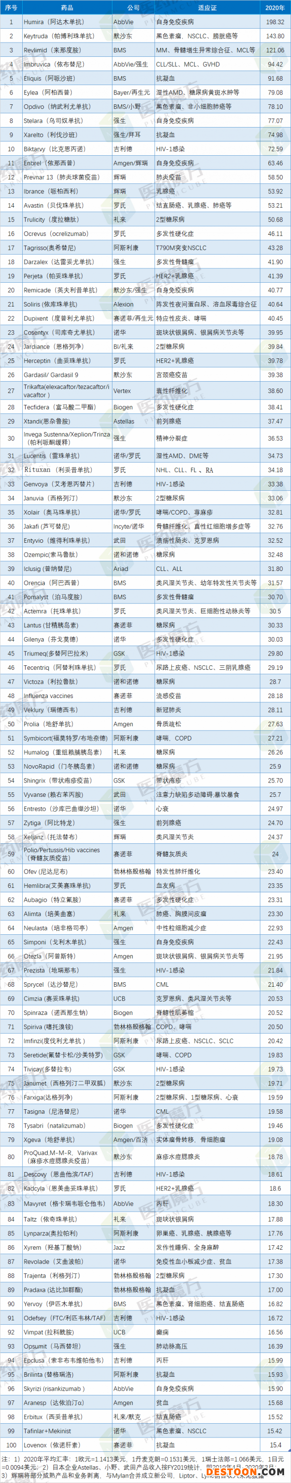 2020年全球藥品銷售額TOP100(億美元)