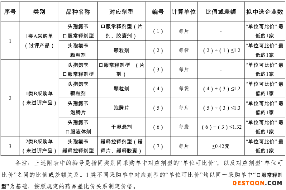符合上述兩類 A、B采購單的頭孢氨芐產(chǎn)品列入本次聯(lián)盟地區(qū)集團帶量采購清單。形成1類A采購單/1類B采購單/2類B采購單,各采購清單中選結(jié)果采取各自競價方式形成。