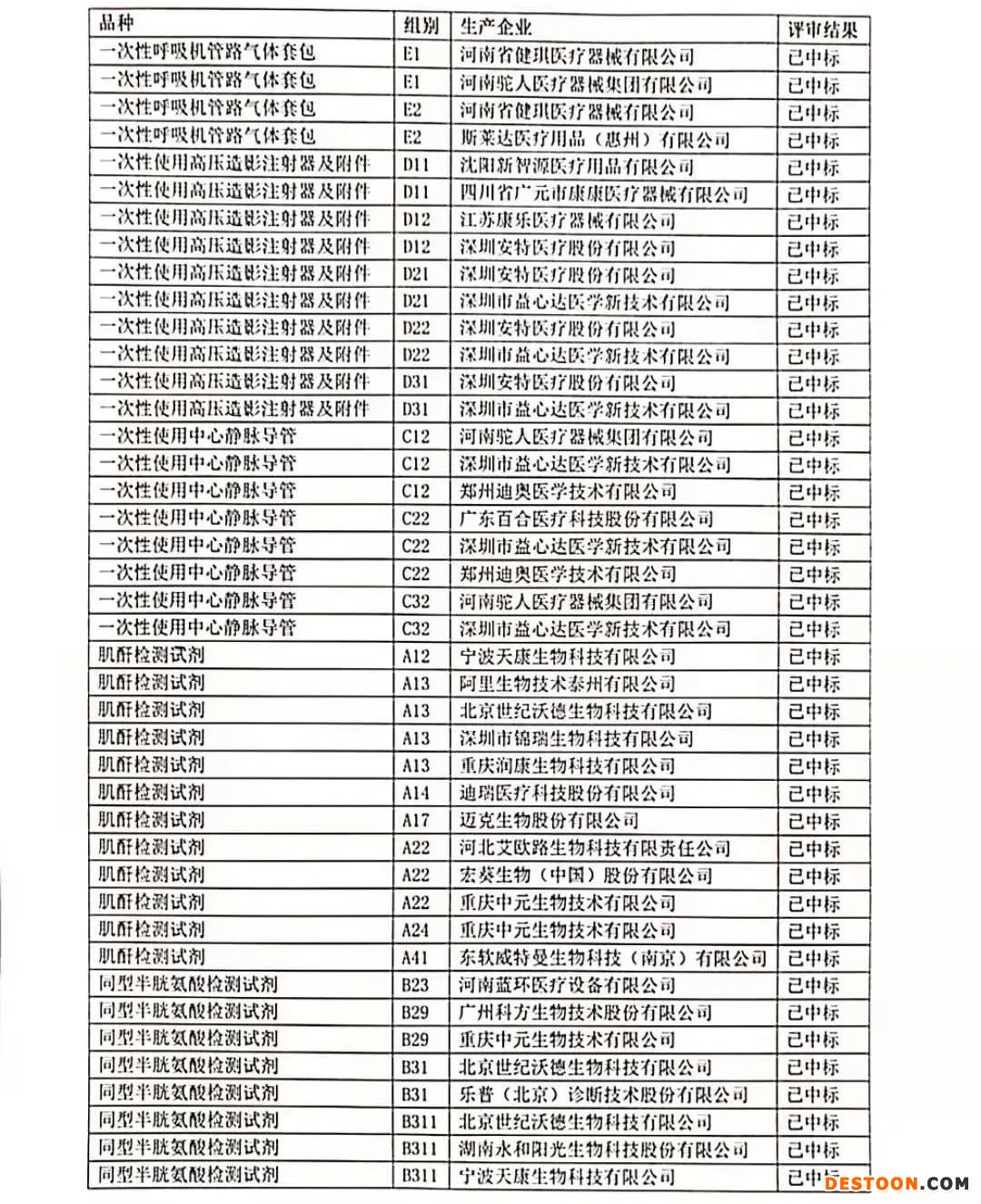 擬中選械企包括河南駝人、深圳安特、廣東百合、阿里生物技術(shù)、東軟威特曼、九強(qiáng)生物、迪瑞醫(yī)療、邁克生物等械企。