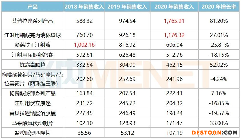 表1:麗珠集團(tuán)2020年銷(xiāo)售額破億的制劑產(chǎn)品情況(單位:百萬(wàn)元)