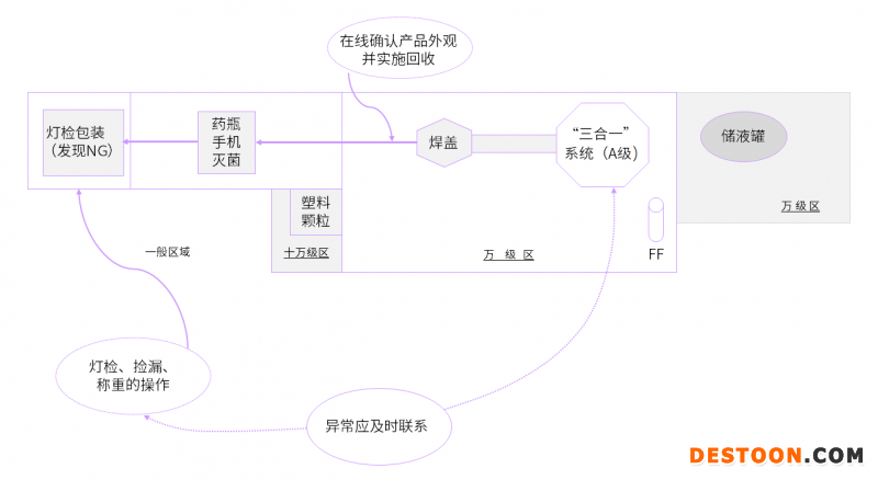 通過(guò)以上介紹表明,BFS技術(shù)在無(wú)菌保證方面總體上比傳統(tǒng)洗灌封工藝優(yōu)勢(shì)明顯,為了保障整個(gè)生產(chǎn)工藝的無(wú)菌水平,還需要與BFS生產(chǎn)線配套的重要設(shè)施和設(shè)備,BFS生產(chǎn)流程示意圖如下: