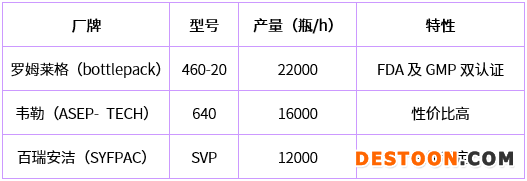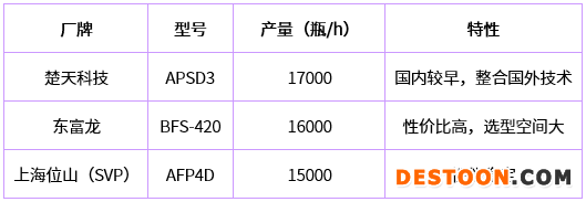 國(guó)內(nèi)生產(chǎn)BFS線的制造商主要有楚天科技、上海東富龍、上海位山等。主要型號(hào)及生產(chǎn)能力如下表所示(以2~5ml灌裝量為例):