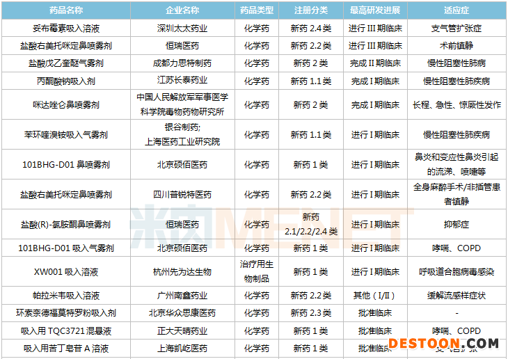 在呼吸系統(tǒng)領(lǐng)域,深圳太太藥業(yè)的妥布霉素吸入溶液(支氣管擴張癥)正在進行III期臨床,有望成為國內(nèi)首個吸入抗生素類藥物;成都力思特制藥的鹽酸戊乙奎醚氣霧劑(慢性阻塞性肺?。┮淹瓿蒊I期臨床;江蘇長泰藥業(yè)的丙酮酸鈉吸入劑(慢性阻塞性肺疾病)已完成I期臨床;北京碩佰醫(yī)藥的101BHG-D01吸入氣霧劑(慢阻肺和哮喘)正在開展I期臨床,這是一款新型的M3受體拮抗劑。