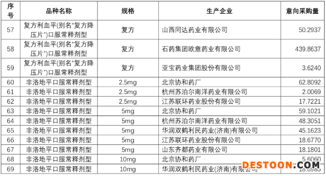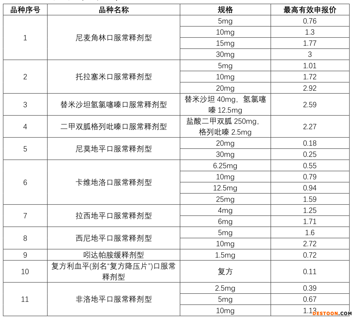 據(jù)了解,共有11個品種被納入采購名單,共24個品規(guī) ,全部為口服品種;包括尼麥角林口服常釋劑型、托拉塞米口服常釋劑型、替米沙坦氫氯噻嗪口服常釋劑型、二甲雙胍格列吡嗪口服常釋劑型、尼莫地平口服常釋劑型、卡維地洛口服常釋劑型、拉西地平口服常釋劑型、西尼地平口服常釋劑型、吲達帕胺緩釋劑型、復(fù)方利血平(別名“復(fù)方降壓片”)口服常釋劑型和非洛地平口服常釋劑型。