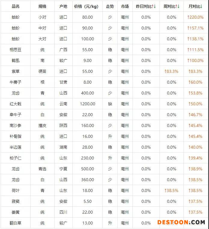 昨日,藥通社發(fā)布了亳州市場(chǎng)截止4月18日中藥材漲價(jià)品種排行榜,其中月漲價(jià)幅度超過(guò)100%的有蛤蚧、相思豆、鶴虱等。