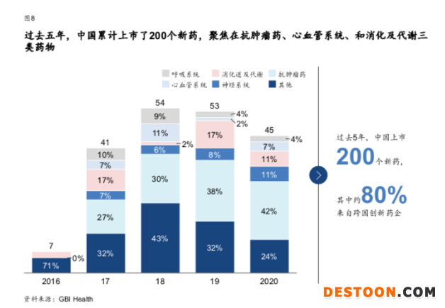 在已經(jīng)上市的200個(gè)創(chuàng)新藥品種中,跨國藥企占到了156個(gè),高達(dá)80%;但是隨著時(shí)間的推移,創(chuàng)新藥的多元性有所提升——2010-2015年間 ,抗腫瘤藥占比高達(dá)47 %,而到了2016-2020年,神經(jīng)系統(tǒng)、消化道及代謝藥物、心血管和呼吸系統(tǒng)的藥物數(shù)量逐漸增加,抗腫瘤藥物占比下降至33%。