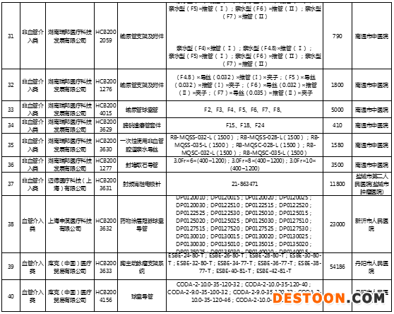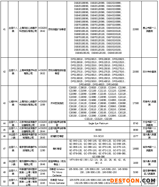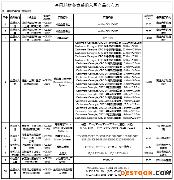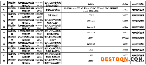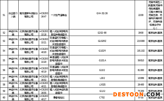 從文件中可以看到,此次共計8大類品種,涉及71個醫(yī)用耗材入圍備案,其中包括微創(chuàng)神通醫(yī)療科技(上海)有限公司的神經(jīng)血管導絲、強生(上海)醫(yī)療器材有限公司的彈簧圈 Codman Microcoil Delivery System、北京品馳醫(yī)療設備有限公司的植入式骶神經(jīng)刺激器套件等。