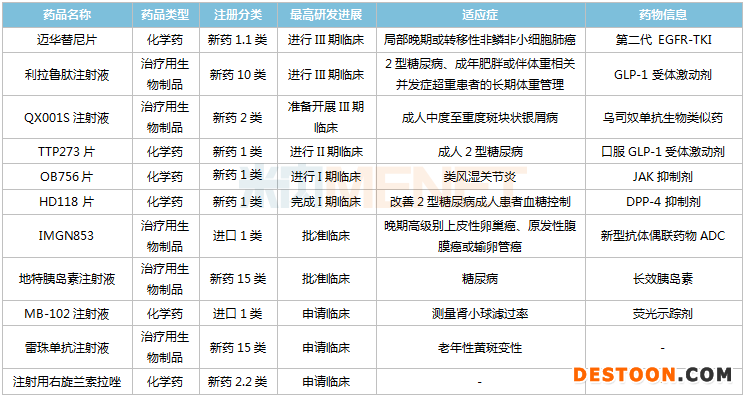 6款1類新藥中,邁華替尼為第二代EGFR-TKI靶向藥,目前正在開展局部晚期或轉移性非鱗非小細胞肺癌的III期臨床,公司爭取以一/二線罕見基因突變的II期單臂臨床試驗結果直接申報上市;口服GLP-1受體激動劑TTP273片正在開展II期臨床,用于治療成人2型糖尿??;JAK抑制劑OB756片正在開展I期臨床,用于治療類風濕關節(jié)炎;引進的IMGN853是一款新型抗體偶聯(lián)藥物ADC,以百日速度完成臨床申報工作,目前已獲批臨床,MB-102注射液為全球首創(chuàng)腎功能監(jiān)測產(chǎn)品。