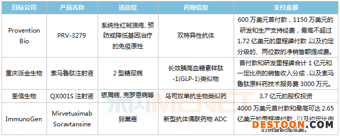 Mirvetuximab Soravtansine是全球首個針對葉酸受體α(FRα)陽性卵巢癌的ADC候選藥物,正在美國開展III期臨床;PRV-3279是一種針對B細胞表面蛋白CD32B和CD79B的人源化雙抗,系統(tǒng)性紅斑狼瘡適應癥正在美國開展I期臨床;索馬魯肽注射液是一款生物類似藥,諾和諾德的產(chǎn)品2020年全球銷售額超過30億美元;QX001S注射液為烏司奴單抗生物類似藥。