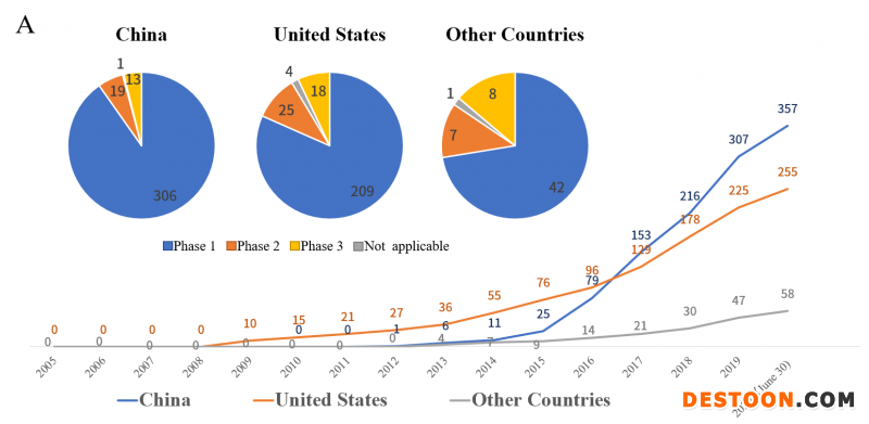 在中國的357項臨床試驗中,有306項屬于I期研究,有19項屬于II期研究,有1項進入了III期研究(于2020年注冊);在美國的256個臨床試驗中,I期、II期和III期試驗的數量分別為209、25和4;在其他國家/地區(qū)的58項臨床試驗中,I期、II期和III期試驗的數量分別為42、7和1[1]。