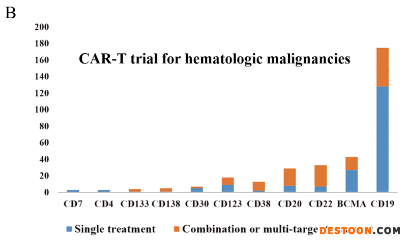 包括非霍奇金淋巴瘤(NHL),間變性大細胞淋巴瘤(ALCL),霍奇金淋巴瘤(HL)在內的淋巴瘤最傳統的治療方法是化療方案和單克隆抗體。上述藥物在一定程度上顯示出臨床成功,但仍有一些患者在這些療法后出現了疾病惡化。必須有一種新穎有效的淋巴瘤療法,CAR-T細胞可用于治療頑固性B細胞淋巴瘤或預后較差的患者。