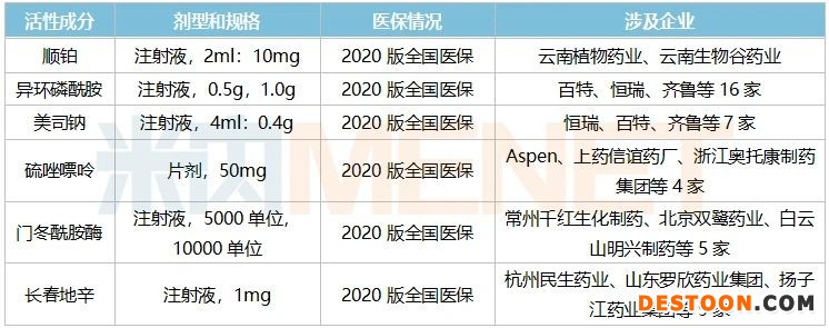 米內(nèi)網(wǎng)數(shù)據(jù)顯示,上述6個(gè)抗腫瘤藥均為2020版全國醫(yī)保目錄品種,恒瑞、齊魯、雙鷺?biāo)帢I(yè)、白云山、揚(yáng)子江等國內(nèi)巨頭均有布局。