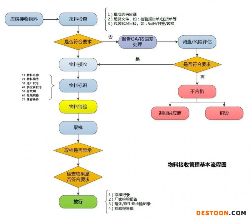 物料接收包括物料從入庫(kù)到存放、取樣、檢驗(yàn)、放行的全過(guò)程, 著重說(shuō)明物料接收的步驟、檢查內(nèi)容和注意事項(xiàng)。
