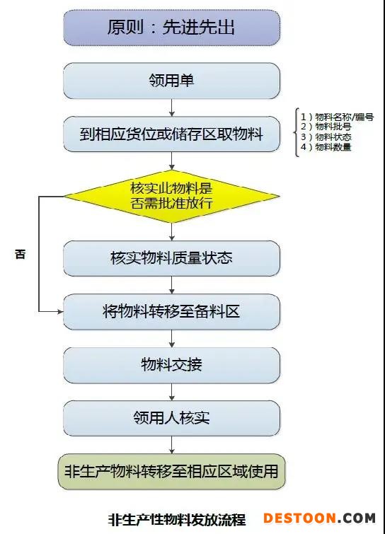 建立生產(chǎn)物料發(fā)放管理程序;物料按批發(fā)放使用;只有經(jīng)放行并有合格狀態(tài)標(biāo)識(shí)的物料方可發(fā)放;根據(jù)生產(chǎn)指令和/或物料提取單核對(duì)發(fā)放物料;發(fā)放生產(chǎn)物料時(shí)應(yīng)檢查物料的外包裝情況。