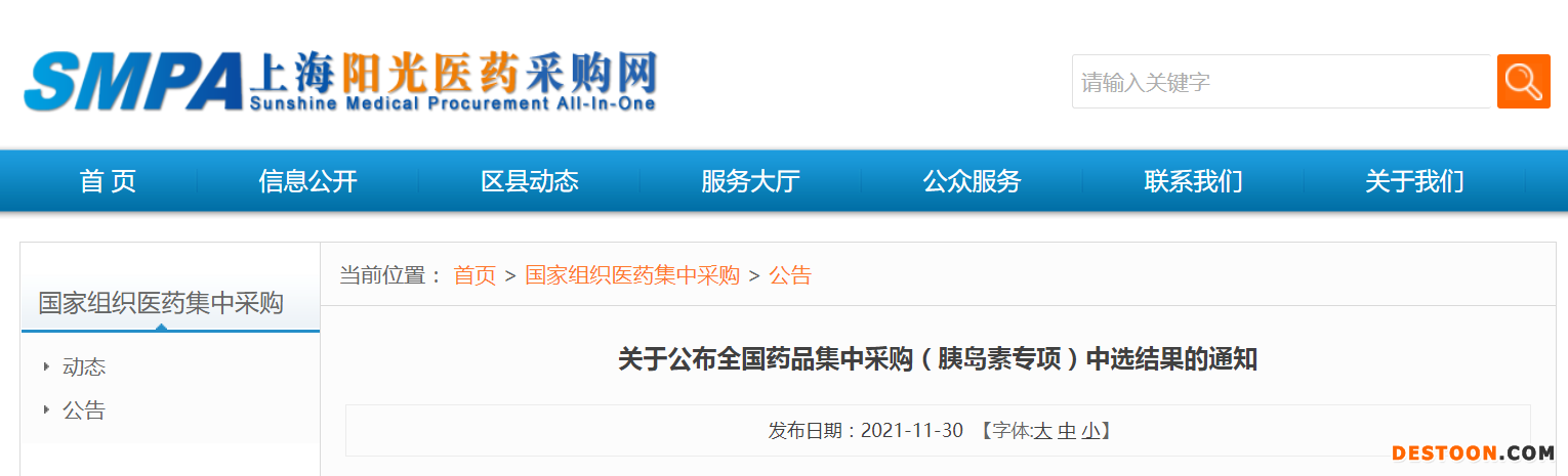 11月30日下午,上海陽光醫(yī)藥采購網(wǎng)發(fā)布公告稱,根據(jù)《全國藥品集中采購文件(胰島素專項(xiàng))(GY-YD2021-3)》規(guī)定,聯(lián)合采購辦公室開展了胰島素專項(xiàng)集中采購工作,現(xiàn)公布中選結(jié)果(詳見附件),具體執(zhí)行日期另行公告。