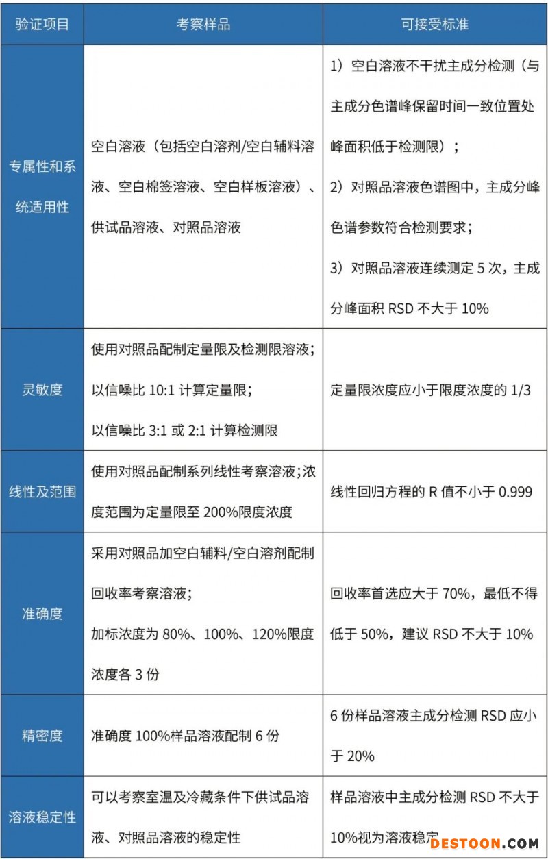 制劑清潔驗(yàn)證分析方法主要驗(yàn)證項(xiàng)目及可接受標(biāo)準(zhǔn)如下: