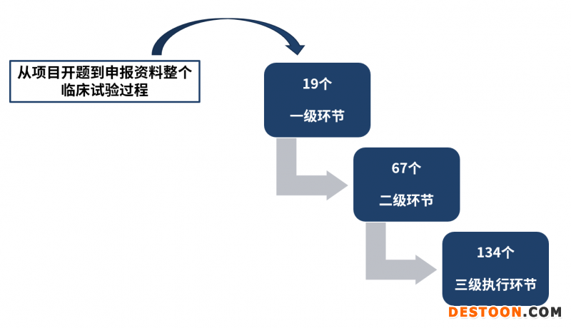 臨床試驗(yàn),從開題、合作方篩選、倫理審查、啟動(dòng)入組等至最后提交注冊申報(bào)資料,共分為: 19個(gè)一級環(huán)節(jié); 包含67個(gè)二級環(huán)節(jié); 各基于風(fēng)險(xiǎn)控制角度,共有134個(gè)三級執(zhí)行環(huán)節(jié)。