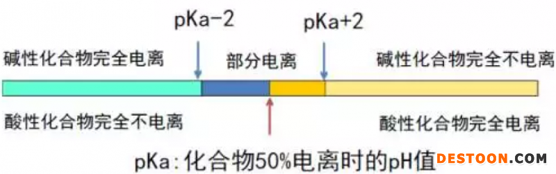 流動相pH值一般選取pKa±2范圍之外,以保障化合物處于分子狀態(tài),減少電離,此狀態(tài)下化合物疏水性較強,色譜柱保留時間較長,能獲得良好的峰型。