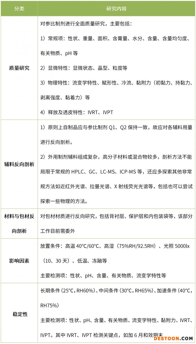 對(duì)小試放大樣品進(jìn)行全面質(zhì)量研究,包括常規(guī)項(xiàng)(性狀、含膏量、水分、含量、含量均勻度、有關(guān)物質(zhì)、pH等)、顯微特性(顯微狀態(tài)、晶型、粒度等)、流變學(xué)特性、賦形性、冷流、黏附力(初黏力、持黏力、剝離強(qiáng)度、黏著力)、IVRT、IVPT等,各質(zhì)量屬性應(yīng)與參比制劑一致。