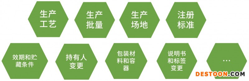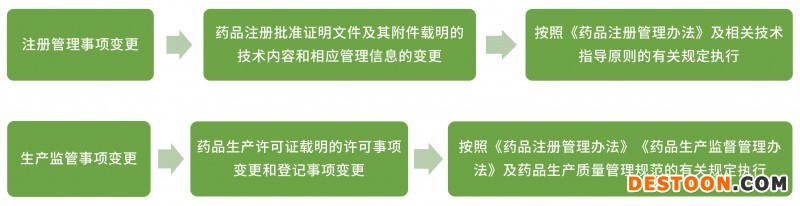 藥品上市后變更包括注冊管理事項(xiàng)變更和生產(chǎn)監(jiān)管事項(xiàng)變更,也就是涉及注冊批件和生產(chǎn)許可證相關(guān)事項(xiàng)的變更。依據(jù)變更對藥品安全性、有效性和質(zhì)量可控性的風(fēng)險和產(chǎn)生影響的程度,將變更劃分為審評類變更,備案類變更和報告類變更。