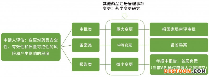 依據(jù)變更對藥品安全性、有效性、質(zhì)量可控性的影響,將藥學(xué)變更分為微小變更、中等變更和重大變更,由申請人依據(jù)對產(chǎn)品的理解進(jìn)行評估及相應(yīng)的研究、申報工作。