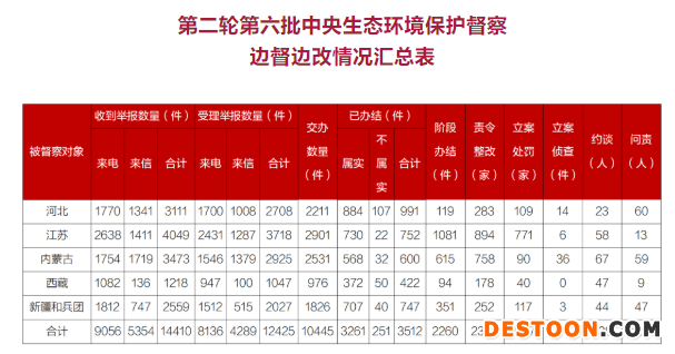 經(jīng)黨中央、國(guó)務(wù)院批準(zhǔn),第二輪第六批5個(gè)中央生態(tài)環(huán)境保護(hù)督察組于2022年3月23日至25日陸續(xù)進(jìn)駐河北、江蘇、內(nèi)蒙古、西藏、新疆五個(gè)省(區(qū))和新疆生產(chǎn)建設(shè)兵團(tuán)開(kāi)展督察。截至目前,各督察組已完成下沉工作任務(wù)。