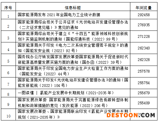 2022年,國家能源局門戶網(wǎng)站訪問量222,270,789次,訪客數(shù)44,625,286人。從閱讀排行看,關注度最高的3篇信息為《國家能源局發(fā)布2021年全國電力工業(yè)統(tǒng)計數(shù)據(jù)》《國家能源局綜合司關于公開征求<光伏電站開發(fā)建設管理辦法(二次征求意見稿)>意見的通知》《國家能源局綜合司關于建立<“十四五”能源領域科技創(chuàng)新規(guī)劃>實施監(jiān)測機制的通知》(國能綜通科技〔2022〕99號),年瀏覽量分別為292458、276935和271228,詳見下表。從站內搜索看,“能源規(guī)劃”“新能源”“風電”“輸配電”“特高壓”等成為高頻詞匯。