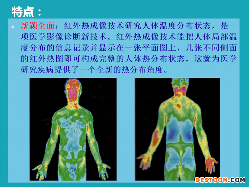 紅外熱成像技術(shù)是一種可視化、可測量的功能影像技術(shù),通過接收人體紅外輻射強(qiáng)弱信號并進(jìn)行計算機(jī)處理后,以不同的顏色表示人體體表不同溫度,說明檢測部位的能量代謝情況。3到5分鐘掃描,可以檢測出身體的各個臟腑,肢體的健康狀況。